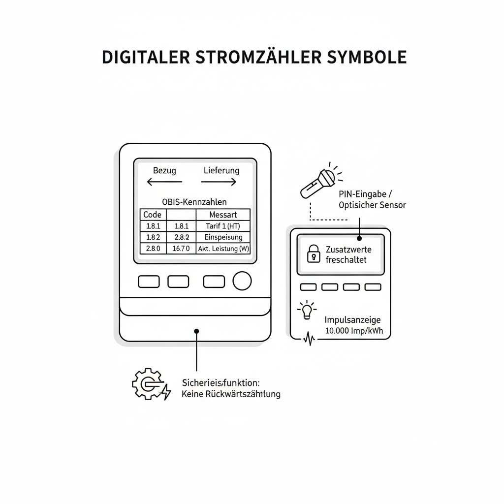 Um die Anzeigen Deines Stromzählers korrekt zu interpretieren, ist es wichtig, die grundlegenden Symboltypen zu kennen. Jeder moderne Stromzähler verwendet standardisierte Zeichen und Codes, die europaweit einheitlich sind. Die drei wichtigsten Kategorien sind Richtungspfeile, OBIS-Kennzahlen und Statusanzeigen.
